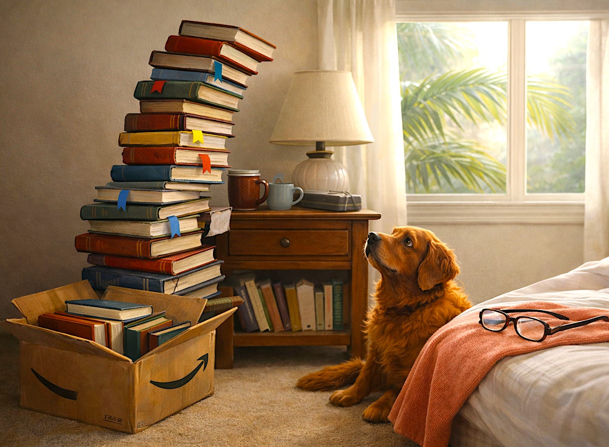 The nightstand is only the beginning. There are books on the kitchen counter. Books on the dining room table. A stack beside my reading chair that I optimistically call “the queue,” as if I’m running a deli and these books have taken numbers. Another pile in my office that arrived in Amazon boxes I haven’t fully unpacked. I know what’s in them. More books. I remember ordering them. I remember thinking, “This one I’ll definitely read.”