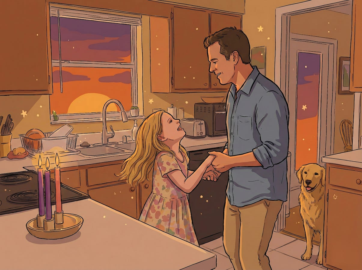 Week 3 of Advent for Everyone explores joy, and this poem returns to the kitchen dance from Sunday’s anchor column. Three candles burn now. The room is fuller. And a memory of spinning with a daughter, no music, just laughter, becomes permission to be ridiculous, to let the body remember what the mind keeps forgetting.